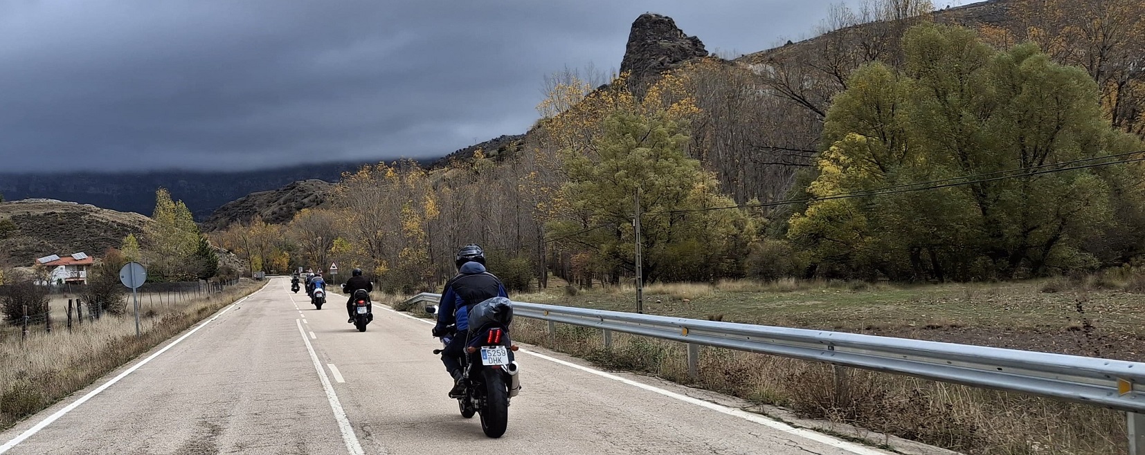 Nos acercamos al garaje a por las motos, que estaba justo detrás de la plaza mayor, y emprendimos la ruta del día. No empezó bien la cosa, ya que salimos con lluvia débil. Paramos en La Puebla de Valverde a llenar depósitos, y seguía lloviendo. A partir de aquí fuimos por una carretera bastante montañosa, la sierra de Javalambre. Una pena el tiempo, que no nos dejó disfrutar de esa carretera. Por fin, al llegar a Riodeva, dejó de llover, y aprovechamos para hacer la primera parada del día en este pequeño pueblo perdido en mitad de la montaña. Había un único bar, y por suerte estaba abierto, así que no nos lo pensamos.
