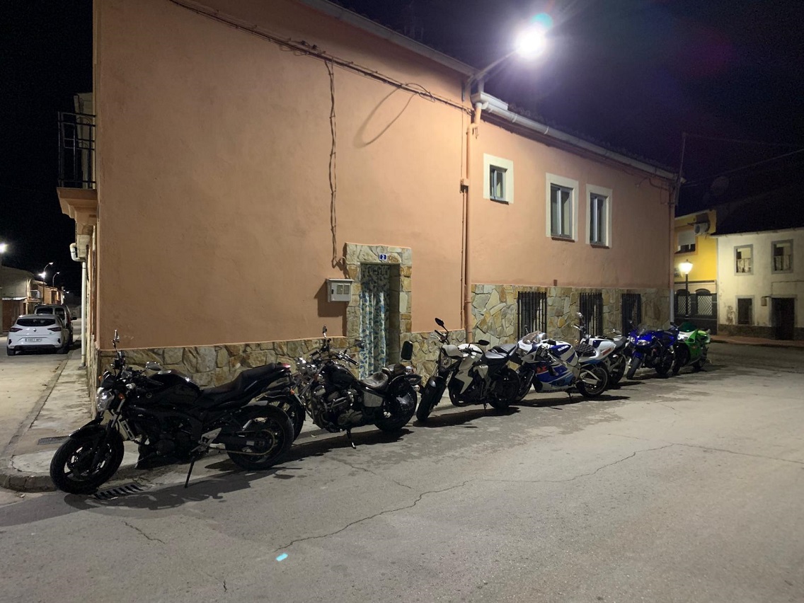 Cuando tocó coger las motos otra vez, hacía ya bastante frio, pero por suerte estábamos a solo diez minutos de Cañamares, donde teníamos el hostal reservado. Cañamares es un pueblo pequeño en la Serranía de Cuenca, sus calles estaban vacías y silenciosas cuando llegamos. Después de instalarnos, fuimos dando un paseo hasta las proximidades de la plaza, donde estaba el que debía ser el único restaurante abierto. Allí cenamos, y después tomamos una copa antes de ir a dormir. Abajo, nuestras motos aparcadas junto al hostal, y el mapa de la ruta de ese día desde Horche.