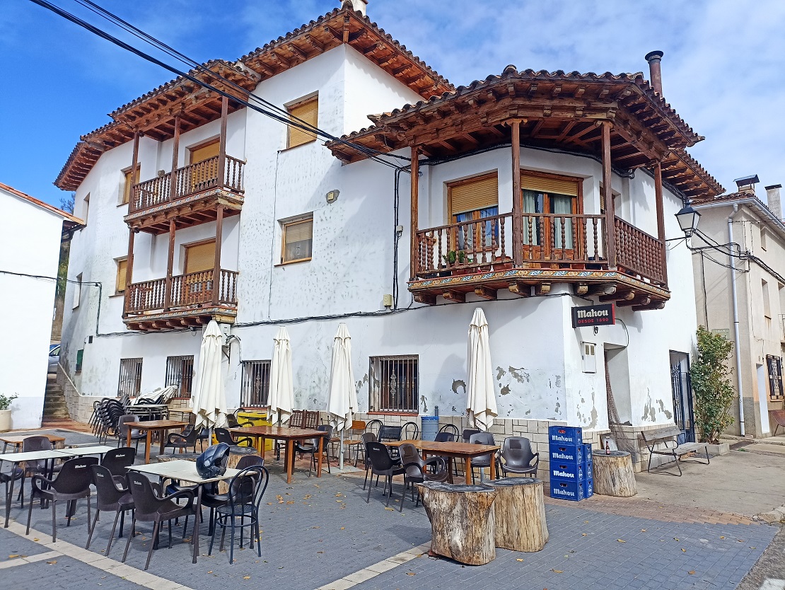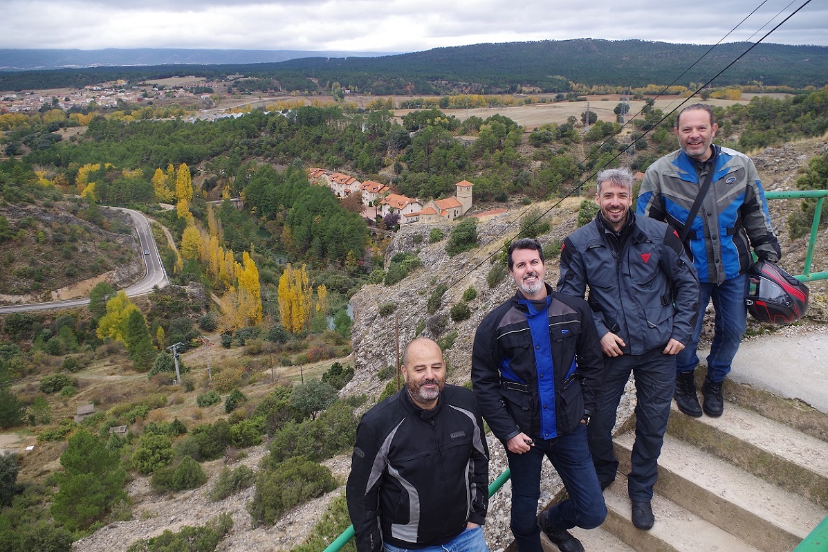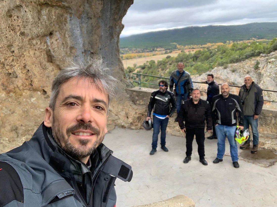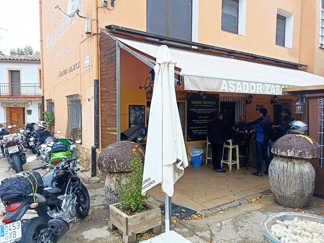 Desde aquí ya no volvió a llover más, incluso acabó saliendo el sol. Aun disfrutamos de unos km más de carretera de montaña hasta desembocar en la N-420 que va directa a Cuenca, ya a partir de ese momento la conducción se vuelve más aburrida. Hicimos otra parada más antes de llegar a Cuenca en Salinas del Manzano, que tiene un bar muy chulo justo al lado de la carretera, en una plaza donde se pueden dejar bien las motos.