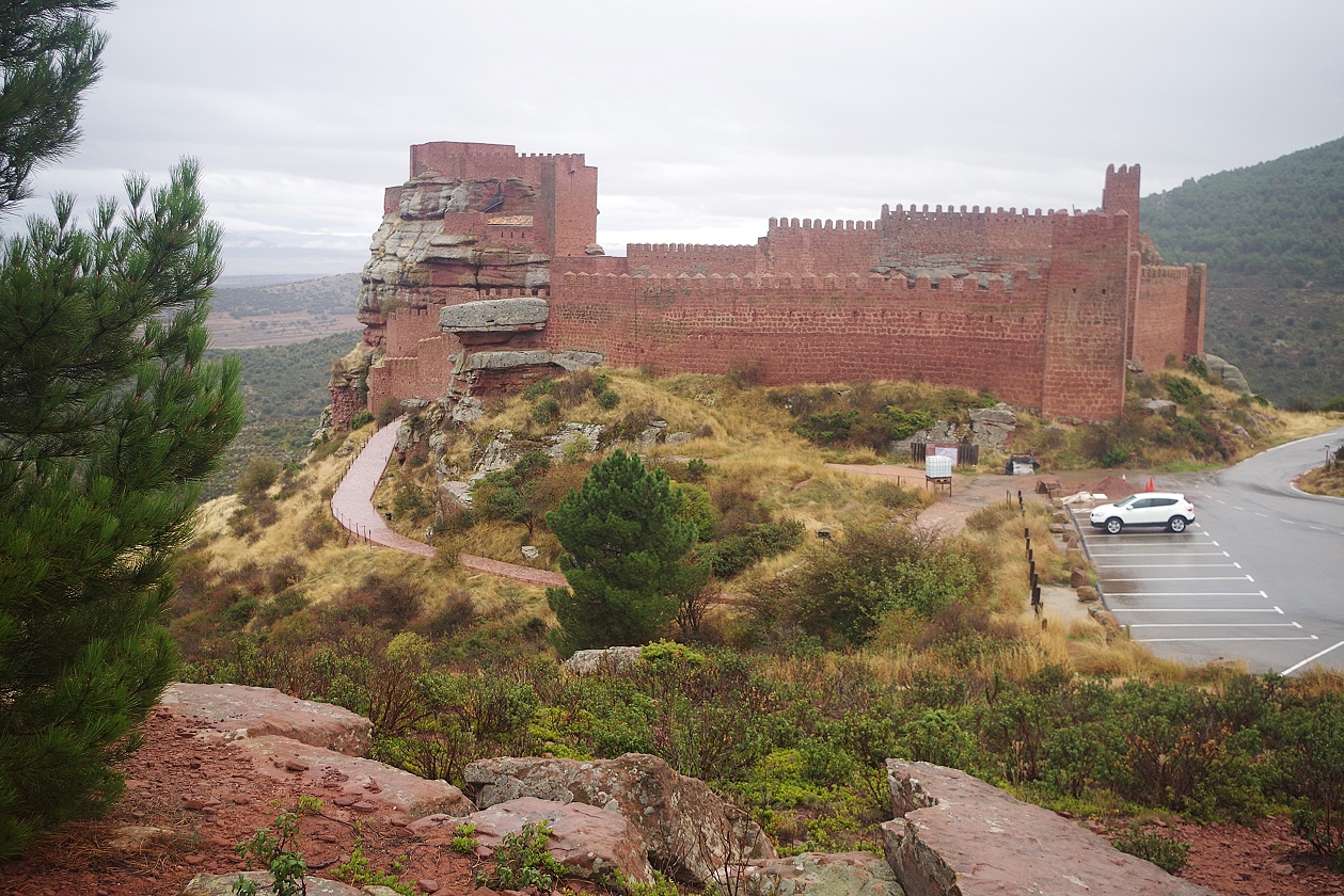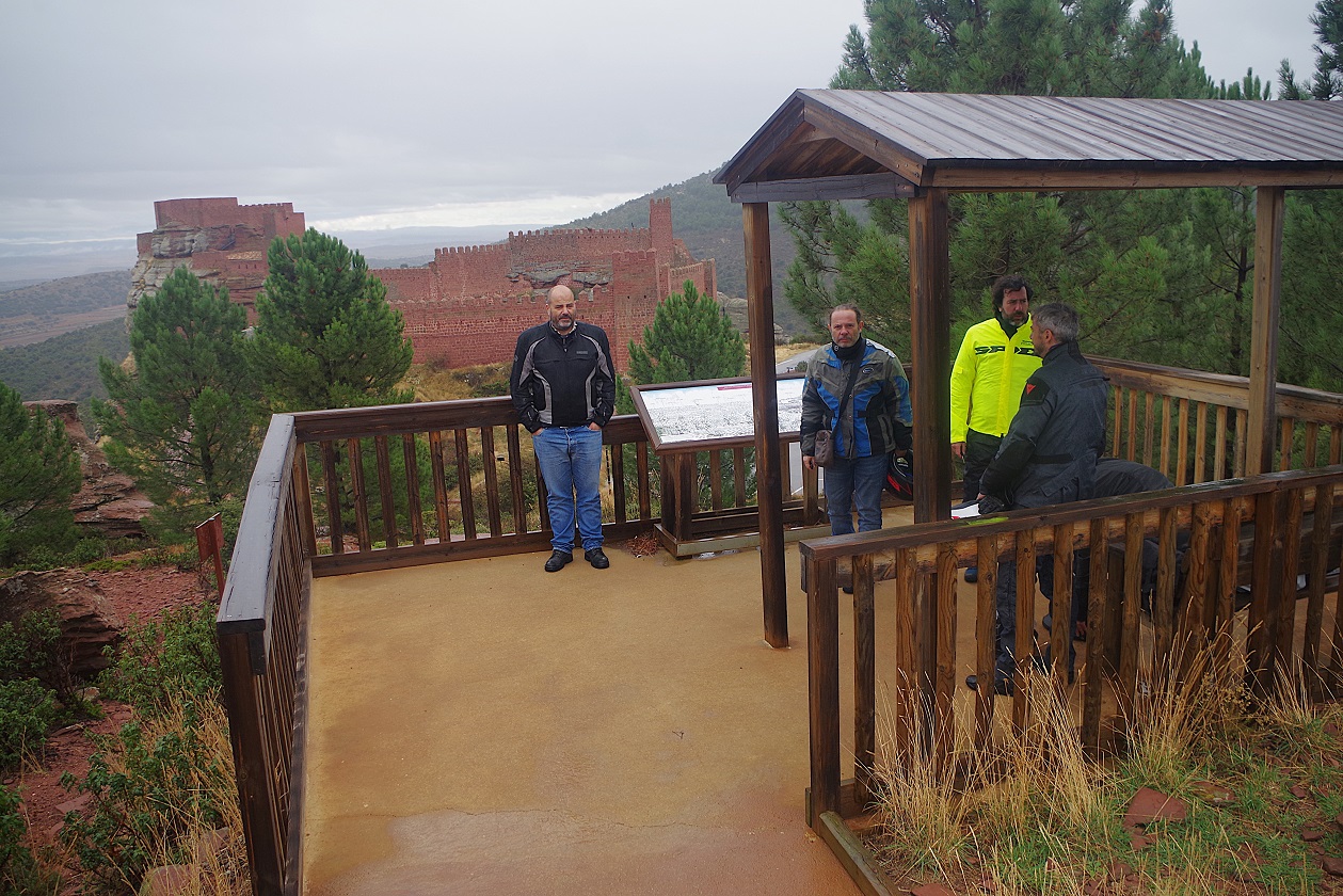 Arriba a la derecha, foto desde la gasolinera de Orihuela. Y desde aquí volvimos a parar en 30 km, en el mirador que hay justo antes de llegar al castillo de Peracense. En este tramo nos empezó a llover débilmente y aprovechamos a ponernos la ropa de agua. Este castillo es muy espectacular, ya que está construído con una piedra arenisca muy rojiza, aprovechando unos riscos que afloran en ese terreno elevado.