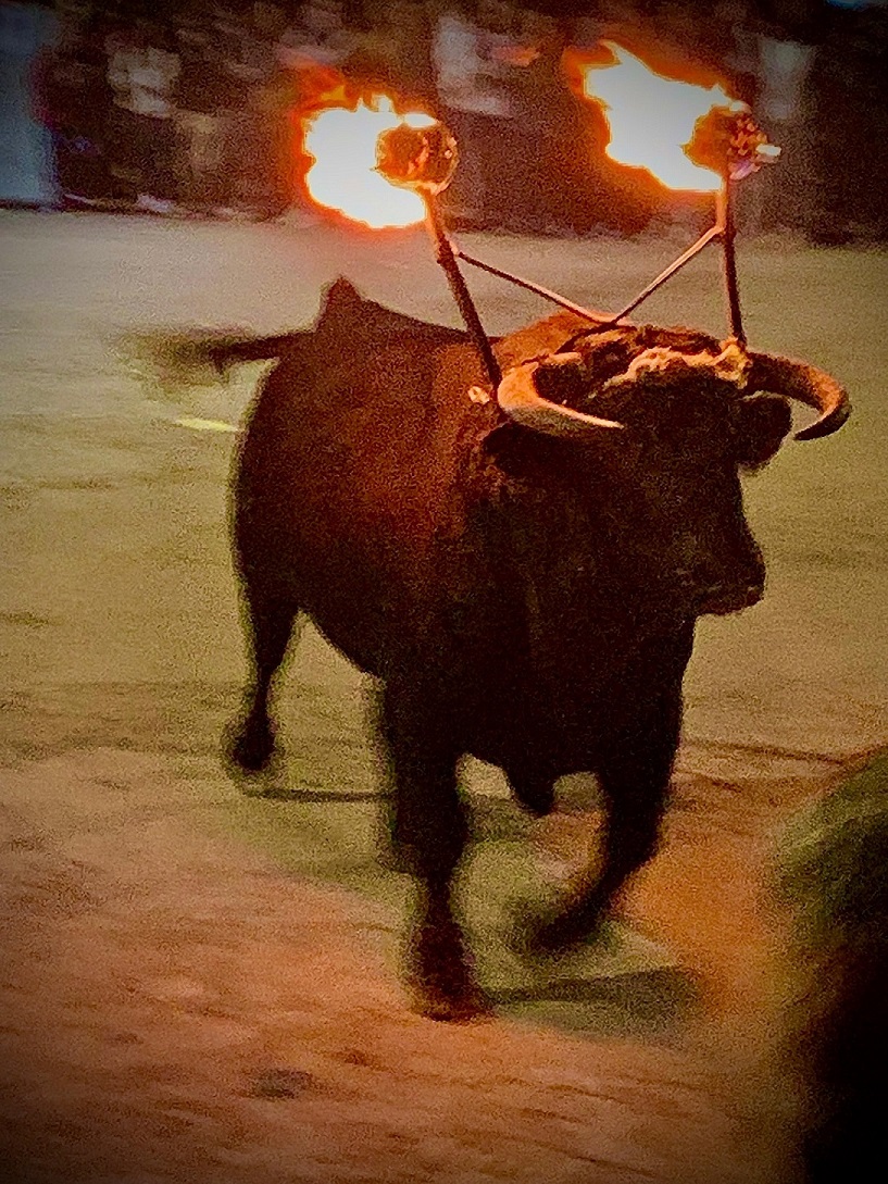 Después de la cena, a base de raciones y más cerveza, estuvimos en otra terraza cercana a la plaza mayor tomando una copa, y a partir de medianoche vimos un poco un espectáculo que habían montado en la misma plaza, que estaba toda vallada y donde habían soltado un toro con un par de antorchas. No estuvimos mucho, enseguida nos fuimos a dormir.