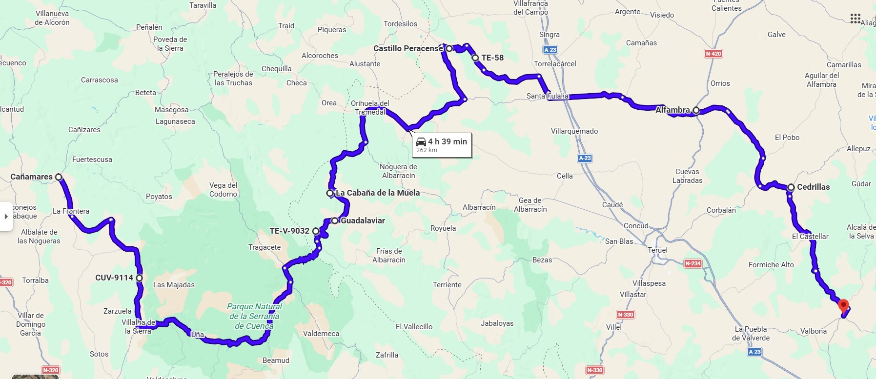 - Día 2: Desde Cañamares, en Cuenca, hasta Mora de Rubielos, en Teruel, parando en el Ventano del Diablo, Uña, Guadalaviar, Griegos y castillo de Peracense. Unos 263 km.
